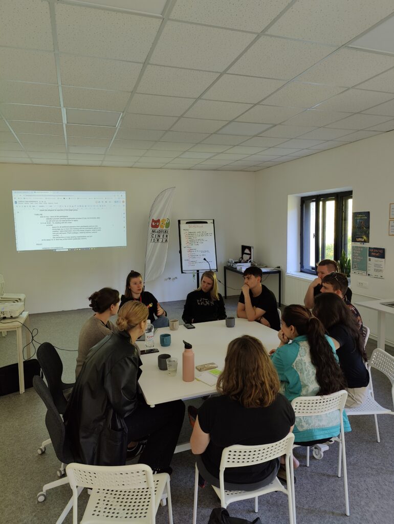 Tako so smo, v nam dobro poznani Idriji zbrali; Maruša in Nejc – trenerja/facilitatorja izmenjave, štirje mladinski voditelji iz Francije, Italije, Češke in Slovenija, dve mladi osebi, ki boste čez čas prevzeli vlogo mladinskega vodje ter ekipa MC Idrije (Nives, Zarja in Jerca).